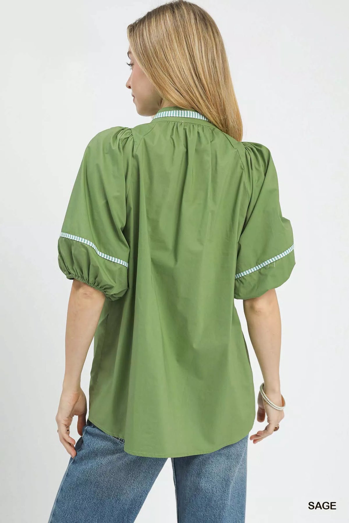 This embroidered floral puff sleeve top is a charming and feminine addition to your wardrobe, featuring intricate floral embellishments for a touch of elegance. The split neckline with contrast stripe trim detail adds a modern twist to the classic silhouette, creating a stylish and fashionable look. The short puff sleeves add a whimsical touch to the top, adding volume and interest to the overall design. Perfect for both casual and dressier occasions, this top is not lined, allowing for breathability and comfort. Elevate your outfit with this standout piece that combines embroidered details, a unique neckline, and statement puff sleeves for a chic and trendy ensemble.