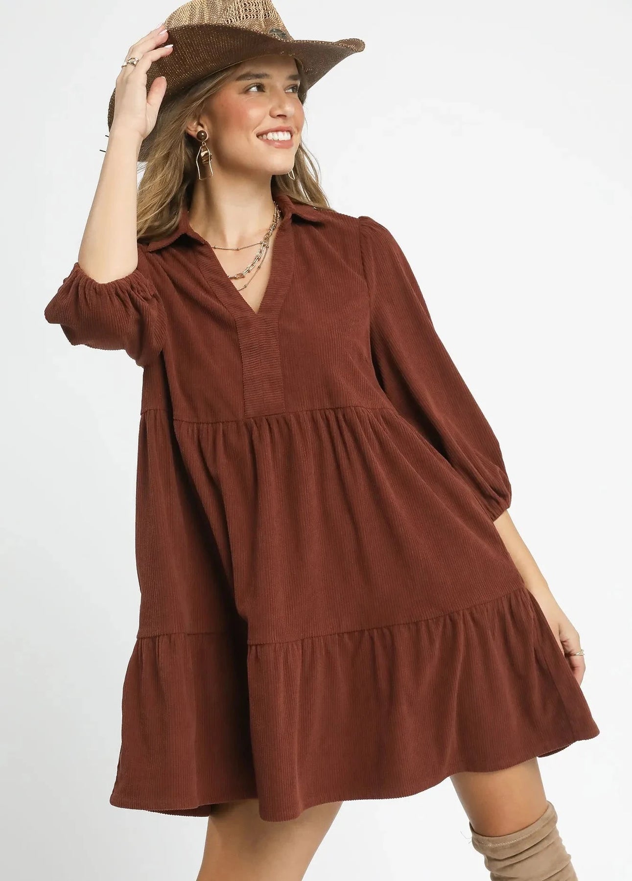 Umgee Tiered Corduroy Mini Dress with Balloon Sleeves